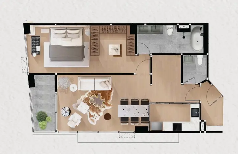 พื้นไม้เต็มพื้นที่ทำให้รู้สึกอบอุ่นและกลมกลืน ไฟแบบฝังและโคมไฟแขวนสไตล์ร่วมสมัยสร้างบรรยากาศที่ดีไม่ว่าจะเป็นตอนทำอาหารหรือพักผ่อน นอกจากนี้ การมีห้องน้ำสองห้องถือเป็นข้อได้เปรียบที่ใช้งานได้จริงในคอนโด 1 ห้องนอน